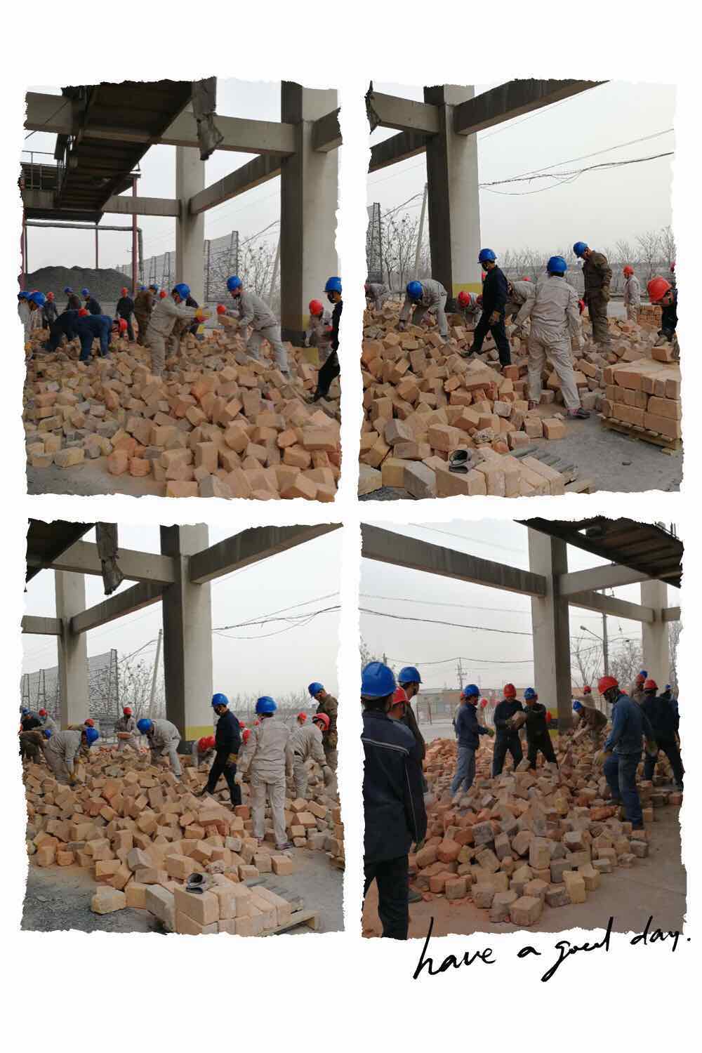 近幾天,公司領(lǐng)導(dǎo)帶領(lǐng)各裝置日勤人員,篩檢白灰窯拆除下來的能重復(fù)利用的舊耐火磚,大家齊心協(xié)力,沒有一句怨言,有的只是埋頭苦干,正是這樣一群可愛的人將美好的希望播種在白灰窯的各個(gè)角落,默默堅(jiān)守辛勤耕耘等待著收獲,絕緣抗壓的勞保鞋,厚實(shí)的手套是他們作戰(zhàn)的防護(hù)裝備,任憑天氣如此炎熱都不會拋棄,他們時(shí)時(shí)刻刻把工作放在心中,讓“勞動”創(chuàng)造者最美的價(jià)值。
