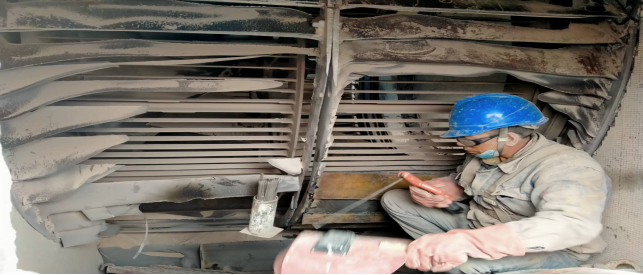 在回轉窯,做好更換窯磚前期準備工作——清理深挖4米處窯皮、窯磚。