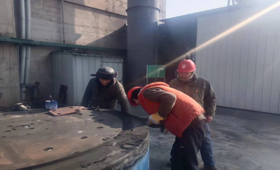 檢修人員鉆進預熱器檢查門子是檢修預熱器管道的“必經之路”,也是支撐徹底完成預熱器檢修的關鍵環節。因為時間緊、任務重,為了不影響檢修進度,檢修人員常常進去干干凈凈,出來時灰土灰臉,不得不輪番上陣,從上到下,完成結皮清理。他們四人一組,從安全監護到技術指導,干一干,歇一歇,接著再繼續……即便是當前零下十幾度,也能干出一身汗,喝口水的功夫,滲出的汗液就能結成冰。