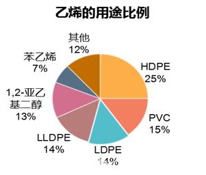 聚乙烯(簡(jiǎn)稱(chēng)“PE”)以及聚氯乙烯(簡(jiǎn)稱(chēng)“PVC”),都與乙烯有相當(dāng)密切的聯(lián)系。乙烯源于液化天然氣、液化石油氣、輕柴油、重油或原油等經(jīng)裂解產(chǎn)生的裂解氣中分出,亦可以從焦?fàn)t煤氣中產(chǎn)生,還可以從乙醇脫水中獲得。在全球聚乙烯制作方法中,其中44%為原油產(chǎn)出石腦油制乙烯,43%為天然氣產(chǎn)出乙烷氣制乙烯,13%為煤炭/天然氣產(chǎn)出甲醇制乙烯。在乙烯的所有用途中,PE和PVC對(duì)乙烯的使用量最大,分別占比53%和15%。