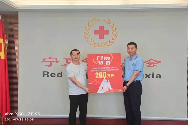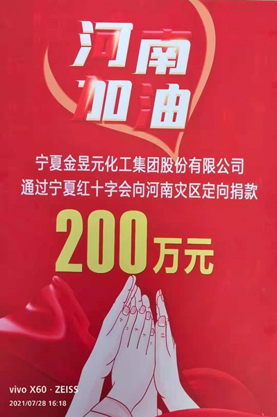 洪災無情,人間有愛。7月28日,寧夏金昱元化工集團股份有限公司委托寧夏紅十字會向河南災區捐助二百萬元,馳援河南受災地區,表達對災區人民的深切問候。